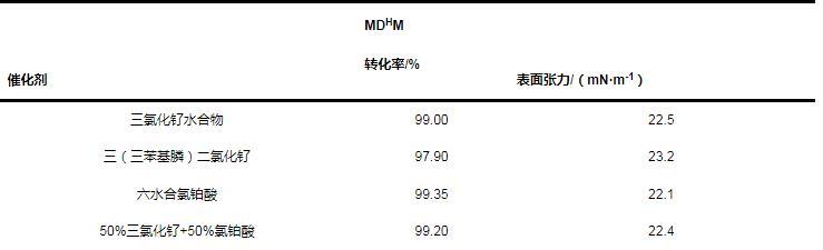 分別以三氯化釕、三(三苯基膦)二氯化釕、六水合氯鉑酸和50%三氯化釕+50%氯鉑酸為催化劑,在以下條件下合成BEOTSS:催化劑用量30 mg/kg(以Ru或Pt質(zhì)量計(jì)),n(BEO)∶n(MDHM)=1.05∶1,反應(yīng)時(shí)間6.0 h,反應(yīng)溫度100℃。測定MDHM轉(zhuǎn)化率以及0.1%BEOTSS水溶液的表面張力,結(jié)果如表1所示??梢钥闯觯@幾種催化劑的效果均較好,MDHM轉(zhuǎn)化率在97%以上,表面張力低于24 mN/m。其中,三氯化釕的催化效果與傳統(tǒng)的氯鉑酸相差不大,只是所得產(chǎn)物為黃色液體,比氯鉑酸的產(chǎn)物顏色深。考慮到三氯化釕價(jià)格比氯鉑酸便宜很多,因此采用三氯化釕作為催化劑具有很好的成本優(yōu)勢。