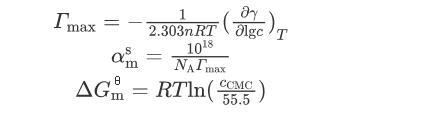 將BEOTSS配制成不同濃度的水溶液,測定其平衡表面張力,繪制表面張力γ與濃度對數(shù)lgc的關(guān)系曲線。當(dāng)γ-lgc曲線出現(xiàn)轉(zhuǎn)折時(shí),轉(zhuǎn)折點(diǎn)對應(yīng)的濃度即為臨界膠束濃度(CMC),對應(yīng)的表面張力為γCMC。飽和吸附量(Γmax)、界面上每個(gè)表面活性劑分子所占的最小面積()以及膠束化標(biāo)準(zhǔn)自由能(Δ)由以下公式[1,21]得到。