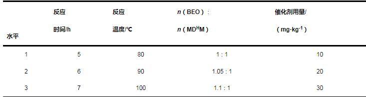 (1)以三氯化釕為催化劑,BEO和MDHM為原料,成功合成了目標產(chǎn)物BEOTSS;采用正交試驗優(yōu)化了催化反應條件:催化劑用量30 mg/kg,n(BEO)∶n(MDHM)為1.05∶1,反應時間6.0 h,反應溫度100℃,在此工藝條件下MDHM轉(zhuǎn)化率可達99%。