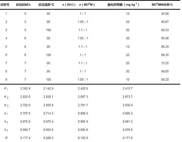 根據(jù)極差R的大小,確定各因素對反應轉(zhuǎn)化率影響的大小順序為:反應溫度B>反應時間A>催化劑用量D>原料配比C。通過正交試驗結(jié)果確定釕催化合成工藝的最優(yōu)方案為A 2 B 3 C 2 D 3,即反應時間6.0 h、反應溫度100℃、n(BEO)∶n(MDHM)為1.05∶1、催化劑用量30 mg/kg。