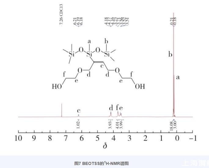 圖7為BEOTSS的1H-NMR譜圖。根據(jù)譜圖中的化學位移及積分數(shù)據(jù)確定化合物中各基團的氫歸屬,得到以下結(jié)果:1H-NMR(400 MHz,CDCl3),δ=6.24~6.16(m,—C=CH—,1H),4.17(m,—CH 2CCHCH 2—,4H),3.72(d,J=5.6 Hz,—CH 2—OH,4H),3.54(t,J=14.6 Hz,—O—CH 2—,4H),0.21(s,—Si(CH 3)3,18H),0.18(s,—SiCH 3,3H)。由于使用氘代氯仿作為溶劑,產(chǎn)物中的2個—OH為活潑氫,在譜圖中沒有出峰,同時結(jié)合紅外譜圖分析,進一步證明本研究成功合成了目標化合物BEOTSS。