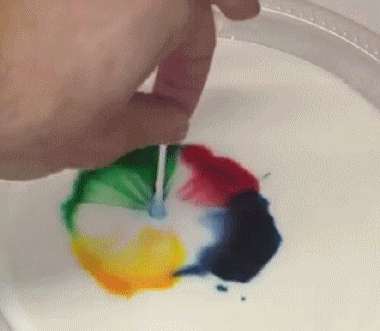 液體食品色素滴在牛奶上,然后把蘸了洗潔精的棉簽杵進(jìn)去,欣賞食品色素的流動。