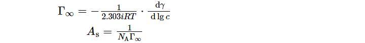 為了更全面地研究表面活性劑溶液性質(zhì),采用Gibbs吸附公式建立了表面吸附量和表面張力及活度之間的關(guān)系,根據(jù)表面活性劑表面張力變化曲線,可利用其得出表面飽和吸附量(Γ∞),由于表面活性劑溶液濃度很小,趨近于稀溶液,其活度可約等于濃度。再通過與阿伏伽德羅常數(shù)的數(shù)量關(guān)系,計算每個吸附分子在溶液表面所占的平均面積(AS)。因此可由如下公式計算: