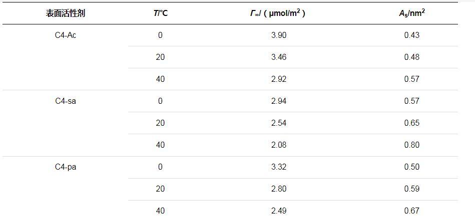 通常較高的?!藓洼^低的AS值表明表面活性劑分子密集地排列在空氣與水的界面上,由上述公式計算得到三種表面活性劑的?!藓洼^低的AS值如表2所示。對比參數(shù)可知,同種表面活性劑的?!蘧S溫度的升高而減小,AS有所增大,吸附表面的分子排布較為松散。這是由于溫度較高的情況下表面活性劑分子熱運動加劇,更易從吸附界面上脫離,并且因無規(guī)則運動導致吸附分子所占面積增大了。溫度升高導致溶解度的增加,因而表面的?!迺兴鶞p小。由于?!捱€受到表面張力隨濃度變化曲線斜率的影響,因此所得趨勢是綜合影響的結(jié)果。此外,由表中還可以看出,C4-sa分子的?!拮钚?,AS最大,在溶液表面的排列更加松散。這可能是由于親水端磺酸基團之間強靜電排斥力,并且空間位阻較大。