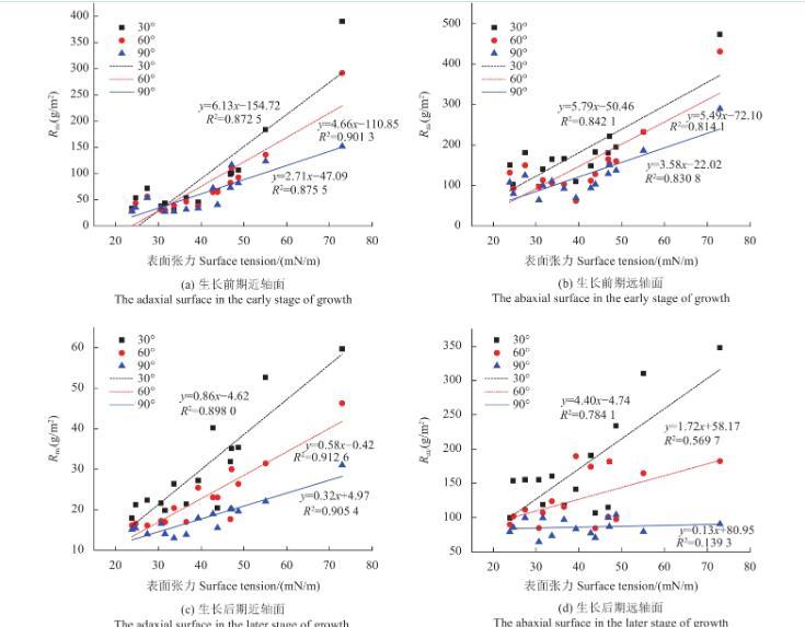 由表2結(jié)果可知,蘋果葉片生長前期近、遠軸面和生長后期近軸面,不同葉傾角下表面張力與Rm值擬合曲線的R2均高于0.80。而蘋果葉片生長后期遠軸面除30°時R2高于0.7外,其他葉傾角下均低于0.6,且隨著葉傾角增大,R2不斷減小,這表明蘋果葉片生長后期遠軸面的表面張力與Rm值之間的線性關系較差。