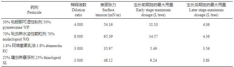 表3為4種常用農(nóng)藥制劑在推薦使用倍數(shù)下對蘋果樹的最大施藥量。從表中可以看出,在蘋果樹生長前期施藥的最大用量遠高于在生長后期施藥??紤]到目前果園中使用的大容量噴霧器械多為手持柱塞泵式機動噴霧機,霧滴粒徑均一性較差,加之人為因素可能導致的藥液無法均勻覆蓋全樹,再結(jié)合張鵬九等在關于不同藥械防治蘋果園桃小食心蟲影響的研究中每株樹推薦使用藥液量為3.5 L,得出在果樹前期推薦藥液的表面張力應在35 mN/m以下,后期應在60 mN/m以上,便于實際操作。