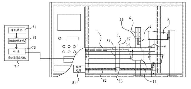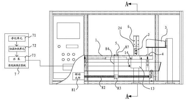 [0018]在一些實(shí)施方式中,還包括清洗液供應(yīng)系統(tǒng),清洗液供應(yīng)系統(tǒng)包括凈化單元、恒溫加熱單元和泵體。清洗液通過(guò)凈化單元凈化并通過(guò)恒溫加熱單元進(jìn)行加熱后,再經(jīng)由泵體供應(yīng)到清洗槽當(dāng)中。其有益效果是,先通過(guò)凈化單元,可以預(yù)先清除掉清洗液當(dāng)中可能存在的油。另外,通過(guò)恒溫加熱單元可以將清洗液加熱到一定的溫度。因?yàn)闇責(zé)釥顟B(tài)的清洗液,可以實(shí)現(xiàn)更加的油脂清除能力,從而可以將樣品上的油更方便且更完全的清洗下來(lái)。