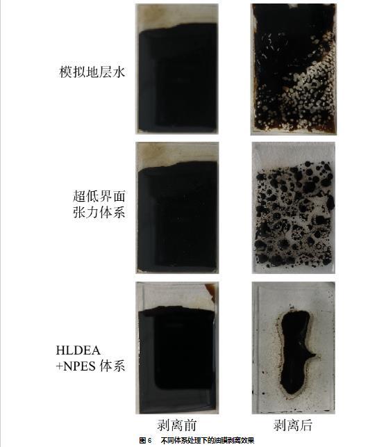 超低界面張力體系具有一定的潤濕調(diào)控性能,可以剝離44.2%的表面油膜,但其油膜剝離效率較差,剝離油膜僅在局部發(fā)揮作用,未能實(shí)現(xiàn)油膜的整體剝離,剝離后表面殘余油膜呈斑點(diǎn)狀。HLDEA+NPES體系的油膜剝離效率(75.3%)遠(yuǎn)高于模擬地層水(24.8%)和超低界面張力體系(44.2%)。HLDEA+NPES體系中HLDEA分子作用于油固界面,改變親油表面潤濕性,有利于油膜收縮;NPES分子作用于油水界面,改變了油水界面的性質(zhì),使得油滴容易變形并脫離玻璃表面,降低了油滴的形變阻力,提高了油膜剝離率。