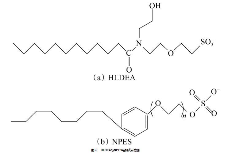 將配制好的穩(wěn)定性優(yōu)異的復(fù)配體系[0.15%(w)HLDEA+0.15%(w)助表面活性劑]置于75℃條件下,測(cè)定復(fù)配體系的油水界面張力,結(jié)果見圖3。由圖3可得,復(fù)配后體系油水界面張力隨時(shí)間均出現(xiàn)先下降后基本保持平衡的趨勢(shì)。HLDEA與兩種陰非離子型表面活性劑APEC-4Na和NPES復(fù)配后體系的油水界面張力降低至接近超低界面張力水平(10?3 mN·m?1)。這是因?yàn)镠LDEA分子小、親油性高,其擴(kuò)散速度快且傾向于進(jìn)入油滴內(nèi)部,同時(shí),溶液中的NPES分子隨時(shí)間推移逐步被吸引于油水界面,尾鏈與HLDEA分子相互糾纏形成緊密結(jié)構(gòu),提高了油水界面吸附膜的致密程度,從而使界面張力大幅降低。最終優(yōu)選出的助表面活性劑為NPES,在與HLDEA復(fù)配后體系界面張力值為3.8×10?3 mN/m。HLDEA與NPES結(jié)構(gòu)式見圖4。作為對(duì)比的超低界面張力體系油水界面張力值為2.9×10?4 mN/m,較HLDEA+NPES體系界面張力低了一個(gè)數(shù)量級(jí)。