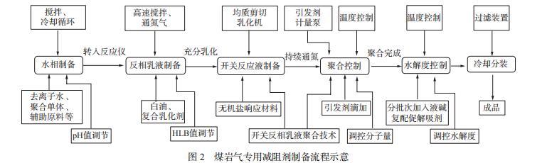 通過對(duì)水相制備—反相乳液制備—開關(guān)反應(yīng)液制備—聚合控制—水解度控制—后處理等—系列過程中pH值、HLB值、引發(fā)劑、溫度等的控制,形成煤巖氣專用減阻劑制備流程,如圖2所示。