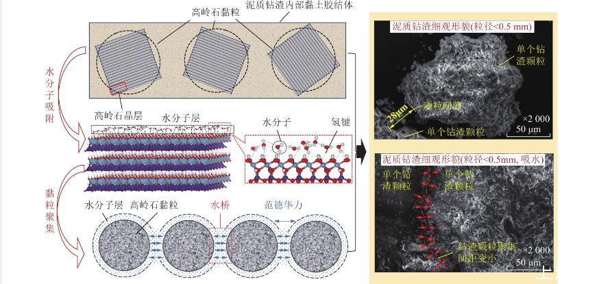 圖2中,在微觀尺度層面,由于高嶺石形成過(guò)程中發(fā)生同晶置換,使晶層表面帶永久負(fù)電荷。當(dāng)高嶺石黏粒遇水時(shí),水分子的偶極性使氫原子易與高嶺石晶層表面電負(fù)性較強(qiáng)的氧原子結(jié)合形成氫鍵,同時(shí),吸附在晶層表面的水分子之間也會(huì)通過(guò)氫鍵連接,該過(guò)程即為水分子的吸附過(guò)程。當(dāng)?shù)?層水分子被高嶺石黏粒吸附后,其外側(cè)氧原子呈負(fù)電性,繼續(xù)與第2層水分子的氫原子以氫鍵形式結(jié)合,最終形成多層水分子“水膜”。高嶺石黏粒不斷吸水?dāng)U層,使鉆渣顆粒體積不斷膨脹,同時(shí)伴隨鉆渣內(nèi)部非泥質(zhì)礦物的溶解,高嶺石黏粒間距變小,并通過(guò)外側(cè)“水膜”相互吸附,構(gòu)成“水橋”,使得多個(gè)高嶺石黏粒能夠在遇水后聚集,形成更大的團(tuán)聚體。