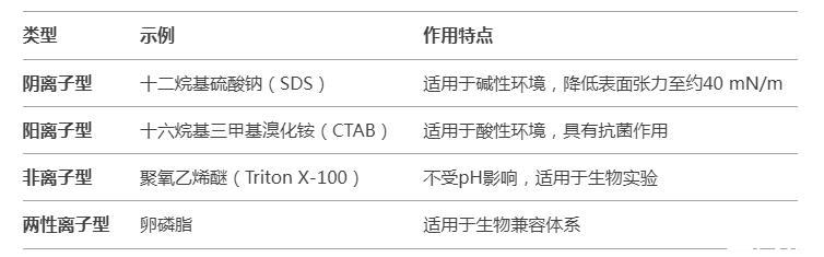 陰離子型十二烷基硫酸鈉(SDS)適用于堿性環(huán)境,降低表面張力至約40 mN/m