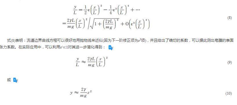 式(8)表明:流道邊界曲線方程可以很好地用拋物線來近似(因為下一階修正項為ε3項),并且給出了確切的系數(shù),可以據(jù)此測出皂膜的表面張力系數(shù)。在實際應(yīng)用中,可以利用ε′?1對其進(jìn)一步簡化得到: