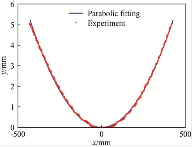 為驗證曲線方程(10),在砝碼質(zhì)量m=0.2 kg、皂液流量Q=35 mL/min時,實測了穩(wěn)態(tài)流動皂膜狀態(tài)下尼龍繩的位置坐標(biāo),如圖2中的離散點所示。尼龍繩位置通過照相得到,為獲得較大范圍內(nèi)的圖像,采用的放大倍數(shù)為1個像素對應(yīng)0.35 mm的物理尺寸。對尼龍繩圖像在水平方向的光強(qiáng)分布進(jìn)行高斯函數(shù)擬合以獲得亞像素的定位精度。圖2中的光滑曲線是采用式(10)進(jìn)行擬合的結(jié)果,與實測曲線吻合良好,驗證了分析的正確性。利用已知的砝碼質(zhì)量,可以進(jìn)一步得到表面張力系數(shù)γ=27.5 mN/m。值得注意的是:當(dāng)砝碼質(zhì)量很小時,表面張力引起的流道收縮很大(在中點O處達(dá)到最大值12%),為避免由此帶來的流速和厚度場改變,在流動皂膜實驗中一般使用m=2 kg的砝碼。