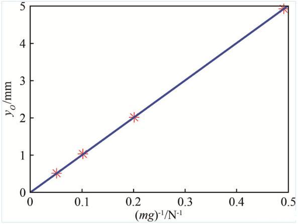 圖3給出了在同一皂液流量Q=35 mL/min下測得的流道中點O的位移隨砝碼質(zhì)量的變化以及根據(jù)式(11)擬合的直線。所有數(shù)據(jù)點都很好地落在過原點的擬合直線上,進(jìn)一步驗證了本文推導(dǎo)的正確性。根據(jù)直線斜率測得的表面張力系數(shù)γ=27.1 mN/m,與前述拋物線擬合法得到的結(jié)果相近。