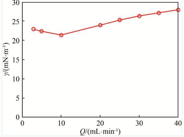 利用這一方法,還測量了表面張力系數(shù)隨皂液流量的變化關(guān)系,如圖4所示。圖中曲線并非如部分文獻(xiàn)報道的“表面張力系數(shù)隨皂液流量增加而單調(diào)下降”,這可能是由于表面張力系數(shù)隨皂膜厚度變化而有所變化、且實驗中皂膜厚度并非均勻分布導(dǎo)致的。