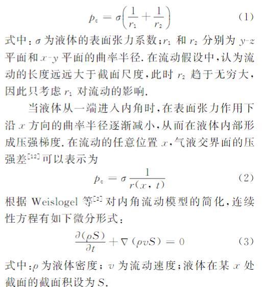 式中:σ為液體的表面張力系數(shù);r1和r2分別為y-z平面和x-y平面的曲率半徑。在流動(dòng)假設(shè)中,認(rèn)為流動(dòng)的長(zhǎng)度遠(yuǎn)遠(yuǎn)大于截面尺度,此時(shí)r2趨于無(wú)窮大,因此只考慮r1對(duì)流動(dòng)的影響。