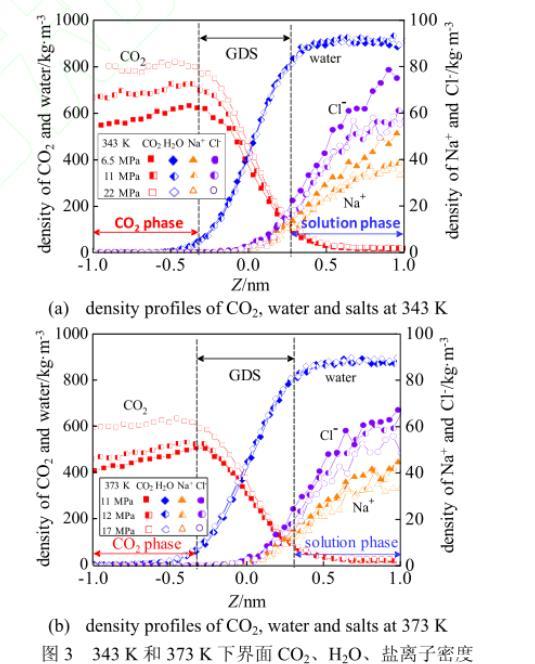 為從分子角度更加詳細(xì)地描述界面性質(zhì)的變化,本文選取并計算了界面處2 nm厚度區(qū)域的CO2、H2O、Na+及Cl-的密度,結(jié)果示于圖3。由圖3可以觀測到:當(dāng)從CO2相向溶液相過渡時,CO2密度逐漸下降,H2O密度則逐漸上升;而鹽離子密度則從界面中心向溶液相,由0逐漸達(dá)到某一穩(wěn)定值。由圖3可以看出,溫度一定時,CO2在CO2相的密度隨著壓強(qiáng)的升高逐漸升高。由[圖3(a)]可以看出,溫度為343 K時,當(dāng)壓強(qiáng)由6.5 MPa升高至22 MPa,CO2相的CO2密度從580 kg·m-3升高至800 kg·m-3左右;而溫度為373 K時[圖3(b)],當(dāng)壓強(qiáng)由11 MPa升高至17 MPa,CO2相的CO2密度從約420 kg·m-3升高至600 kg·m-3左右。此外,對比圖3(a)和(b)還可知,當(dāng)壓強(qiáng)恒定在11 MPa時,溫度由343 K升高到373 K,CO2相的CO2密度則由700 kg·m-3降至420 kg·m-3左右。