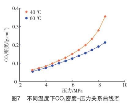 一方面,高溫可以對(duì)液體分子之間的相互作用力產(chǎn)生削弱作用,加劇分子間的不規(guī)則運(yùn)動(dòng)。此時(shí),CO2氣體分子更容易與液相發(fā)生混溶,而定量表現(xiàn)出來的就是界面張力的降低。另一方面,根據(jù)混合烷烴和CO2的密度和二者的密度差數(shù)據(jù),繪制出不同溫度下CO2氣體密度和氣液密度差隨壓力升高的變化曲線,如圖7~圖9所示。從密度差-壓力曲線(見圖9)來看,隨著溫度升高,在可比較的實(shí)驗(yàn)壓力范圍內(nèi),中低壓(3~6 MPa)下不同溫度的氣液密度差非常接近,可以忽略不計(jì)。但高于6 MPa后,高溫下氣液密度差逐漸加大。較高的密度差導(dǎo)致了氣液難以形成混相,同一壓力下界面張力更大。