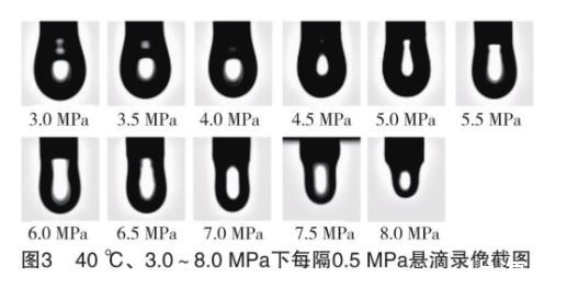 實(shí)驗(yàn)后得到的直接數(shù)據(jù)是一系列的懸滴錄像,圖片示例如圖3所示。根據(jù)錄像計(jì)算不同溫壓下混合烷烴和CO2的界面張力。