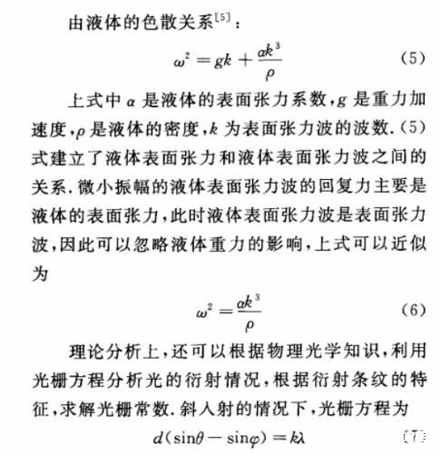 d為光柵常數(shù),在此情況下,光柵常數(shù)即為液體表面張力波的波長(zhǎng),θ為斜入射角,φ為衍射角,k為衍射級(jí)次,λ為光波的波長(zhǎng)。通過(guò)測(cè)量觀測(cè)距離、衍射條紋的間距等量可求出衍射角和光柵常數(shù)。再根據(jù)液體的色散關(guān)系(5)式,求得液體表面張力。具體的測(cè)量和求解過(guò)程,這里不再贅述。