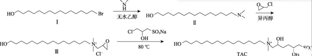本文擬以15-溴-1-十五醇、二甲胺水溶液、環(huán)氧氯丙烷、3-氯-2-羥基丙磺酸鈉為原料,通過季銨化反應和開環(huán)反應制備了甜菜堿表面活性劑(TAC)。通過聚合物和表面活性劑分子的疏水單元組成的混合膠束與聚合物主鏈發(fā)生物理交聯(lián),從而產(chǎn)生擴展的聚合物網(wǎng)絡,以期改善稠化酸的耐溫、耐剪切性能,提高180℃高溫地層的油氣采收率。