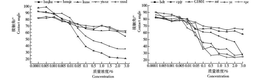 圖1 5種農(nóng)藥和6種助劑不同濃度藥液與辣椒葉面的接觸角