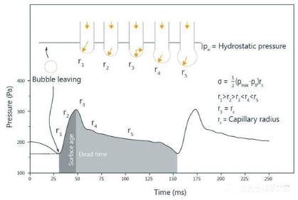 測量結果對應的是一定表面年齡下的表面張力,表面年齡為從氣泡開始產生到最大壓力之間的時間。表面張力對表面年齡的關系可以通過不同的鼓泡速度測出。