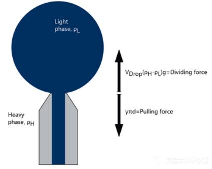 由于界面張力γ的作用,液滴試圖在體相中保持盡可能小的界面。當液滴從毛細管上脫落時,新的界面產生,這需要克服相應的界面張力,液滴直到舉升力能夠補償毛細管潤濕長度上的界面張力時才會脫落,關系式如下:g=重力加速度,V=液滴體積,d=毛細管內徑,Δp=兩相密度差