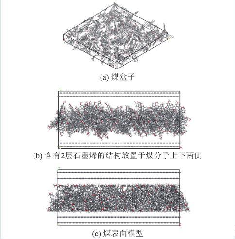 采用Materials studio分子動(dòng)力學(xué)軟件中的Amorphous Cell功能,建立一個(gè)由150個(gè)wender無煙煤分子組成的煤盒子(圖10a),煤盒子的長和寬均為10 nm;然后創(chuàng)建一個(gè)與煤盒子等長/等寬的含有2層石墨烯的結(jié)構(gòu),通過Build layers功能將含有2層石墨烯的結(jié)構(gòu)放置于煤分子上下兩側(cè)(圖10b);最后,通過不斷的壓縮、移動(dòng)及結(jié)構(gòu)優(yōu)化操作,將上下兩側(cè)的石墨烯結(jié)構(gòu)刪除,獲得平整的煤表面模型(圖10c)。