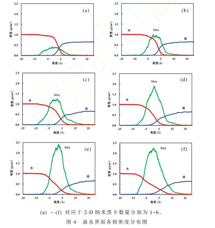 運用所構建的油水界面模型,研究2-D納米黑卡(NSA)在油水界面的密度分布及吸附行為,模擬結果如圖4所示。納米黑卡數量增加時,界面處油相密度變化幅度大。這是由于隨著納米黑卡數量的增加,接枝的直鏈烷烴與油相相互作用不斷增強所致。當體系達到平衡狀態(tài),納米片大部分浸沒在水相中,直鏈烷烴主要浸沒在油相中。此時,納米黑卡所處的平衡位置受到納米黑卡重力和分子間相互作用力的影響很大,分子間相互作用力包括范德華力和靜電力。納米片偏親油性,顯示出與油水分子間的弱范德華力,而直鏈烷烴與油相分子間存在強范德華力,因此納米片被拉向油相。隨著納米黑卡數量的增加,油水界面納米片的密度隨之增加。納米黑卡的密度在中線附近出現峰值,當納米黑卡數量增至4片后繼續(xù)增加黑卡數量,在中線部分納米黑卡的密度增加量并不明顯,只是高峰變寬了。