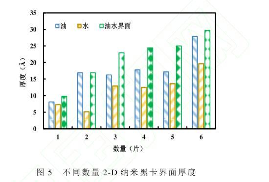 假設2-D納米黑卡全部平鋪在油水界面,其表面積與油水界面面積的比值即為界面覆蓋率(RIC)。不同數量的納米黑卡在油水體系中的界面覆蓋率和界面厚度見圖6。界面覆蓋率與界面厚度隨著納米黑卡數量的增加逐漸增加,且界面覆蓋率呈指數增加,而界面厚度呈對數增加,納米黑卡數量由1增至6時,界面覆蓋率分別為0.16、0.31、0.46、0.91、1.34和2.64。當納米黑卡數量增加到一定程度時(納米黑卡數量為4片),油水界面幾乎全部被覆蓋,界面覆蓋率在1左右,此時的界面厚度達到相對穩(wěn)定的狀態(tài),界面呈單層且平鋪吸附狀態(tài);當黑卡數量繼續(xù)增加,界面覆蓋率指數增加,界面厚度也隨之增加,此時納米片呈受擠壓狀態(tài),出現褶皺態(tài)和重疊疊加態(tài),繼續(xù)增加納米黑卡數量,界面達到飽和,界面厚度不再增加,多出的黑卡分散在水溶液中,由于黑卡本身存在弱范德華相互作用,片片間不斷疊加,成為團聚態(tài),從而形成沉淀。該沉淀物質以弱范德華相互作用團聚在一起,當遇到剪切、稀釋、振蕩等外界作用時會重新分散在水溶液中,發(fā)揮其單片的作用。