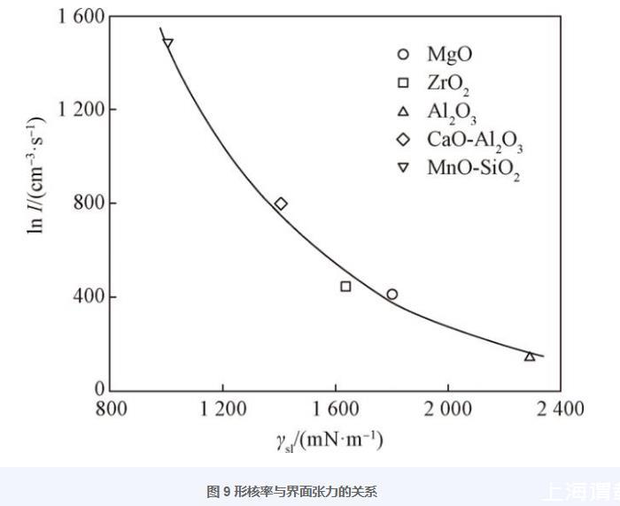 夾雜物的形核與夾雜物和鋼液間的界面張力有關(guān),式(7)~式(9)為關(guān)于界面張力的函數(shù)??芍?,夾雜物與鋼液間的界面張力降低,臨界過飽和度S*降低,夾雜物的形核率升高。