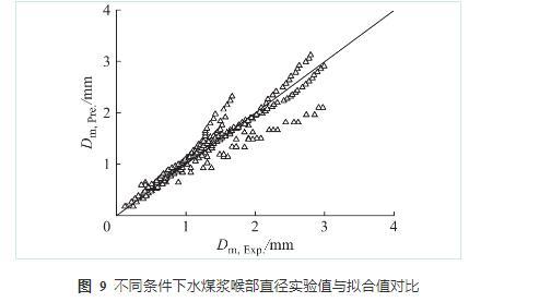 圖9所示為不同條件下水煤漿喉部直徑實(shí)驗(yàn)值(Dm,EXP)和擬合值(Dm,pre)對比。從式(5)和圖9可以看出:影響水煤漿喉部破裂特性的主要參數(shù)包括動(dòng)態(tài)表面張力、黏度、屈服應(yīng)力等;在不同煤種和水煤漿質(zhì)量分?jǐn)?shù)條件下,水煤漿破裂末期的喉部直徑變化趨勢保持一致,表明水煤漿微觀破裂過程具有一定的相似特性。