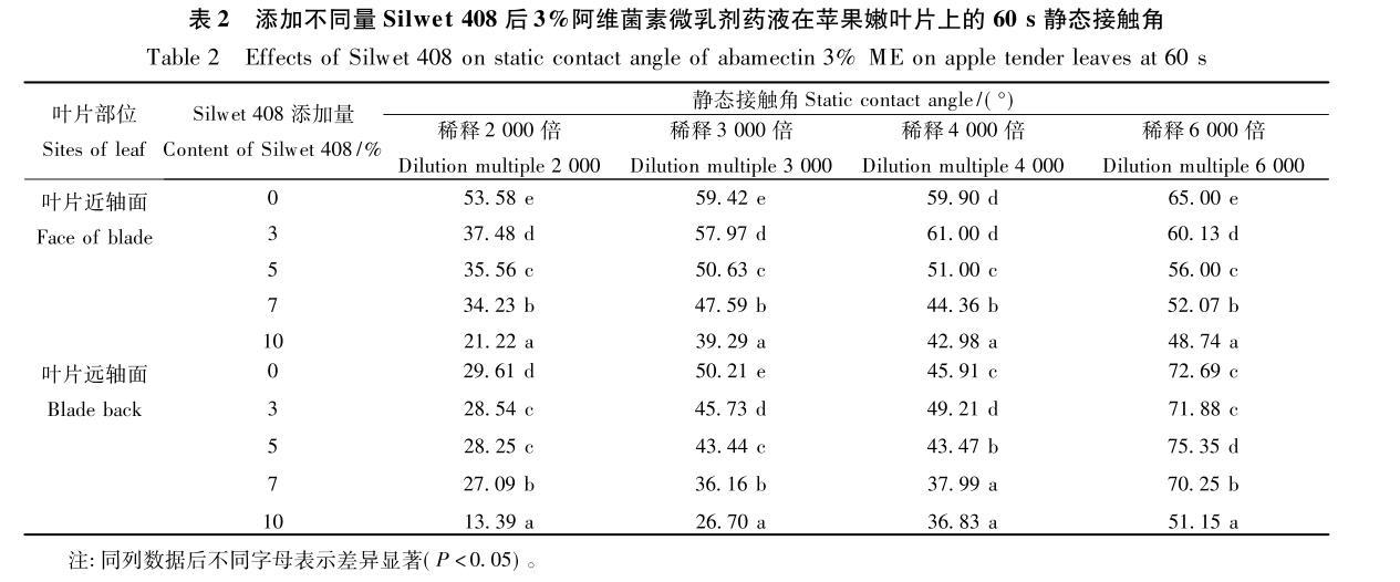 本研究表明,3%阿維菌素微乳劑中添加Silwet 408可顯著降低藥液表面張力及其在蘋果葉片上的接觸角,且表面張力和接觸角的變化與助劑添加量和葉片的狀態(tài)相關(guān)。因此在實(shí)際生產(chǎn)中,應(yīng)根據(jù)害蟲為害的部位及葉片狀態(tài)等,有針對(duì)性地選擇適宜的表面活性劑及其添加量。