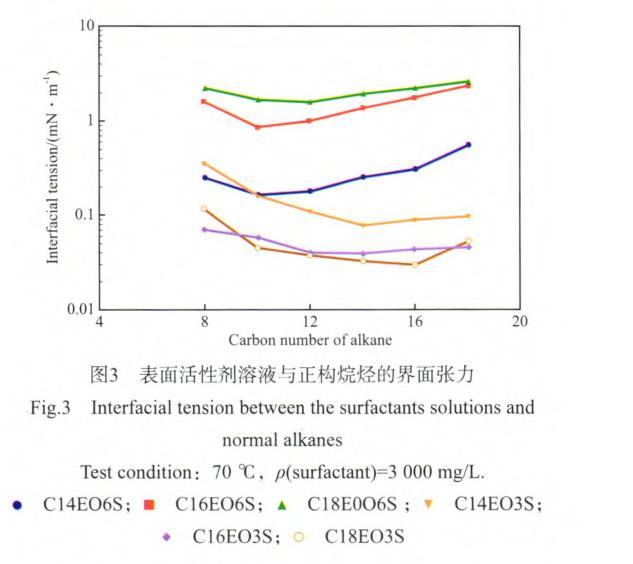 用模擬臨盤油田地層水將脂肪醇聚氧乙烯醚磺酸鹽配制成質(zhì)量濃度為3 000 mg/L的溶液,在70℃下測(cè)得C14EO3S,C16EO3S,C18EO3S表面活性劑與原油間的界面張力分別為0.076,0.041,0.034 mN/m。表面活性劑溶液與正構(gòu)烷烴的界面張力見圖3。
