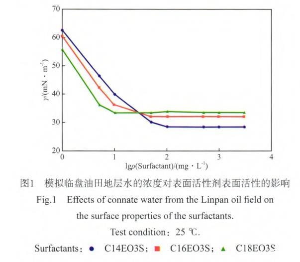 圖1模擬臨盤油田地層水的濃度對(duì)表面活性劑表面活性的影響
