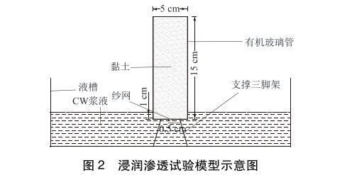 浸潤滲透試驗模型如圖2所示,主要由液槽、支撐三腳架和透明有機玻璃管組成。有機玻璃管直徑5cm,高15cm,頂端敞開,底部封閉鉆有直徑0.5cm的進漿孔。試驗時將黏土裝入有機玻璃管中,振搗壓實,底部開孔處墊有紗網(wǎng),防止土體掉落。將有機玻璃管和支撐三腳架放入漿液槽內,有機玻璃管底部浸入漿液液面以下1.0cm,使?jié){液從底部滲入黏土中,通過觀察漿液在不同時間的滲透高度來評價漿液的浸潤滲透效果。