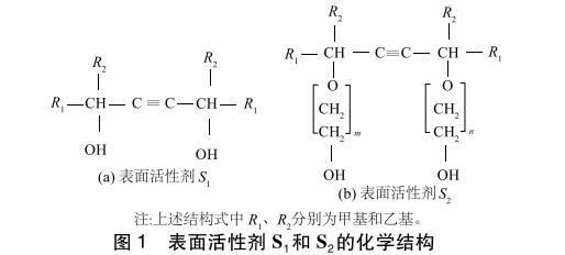 ?炔屬二醇表面活性劑(S1、S2),其臨界膠束濃度(CMC)為0.1%,化學結構如圖1所示,美國氣體化學公司生產;