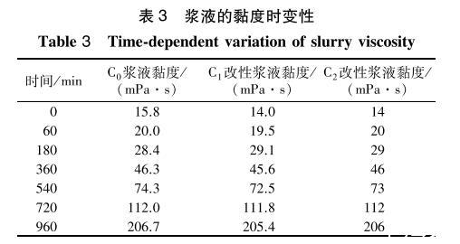 3種漿液在23℃條件下黏度隨時間變化關系見表3??梢钥闯?3種漿液的黏度均隨時間的增長而逐漸變大,表面活性劑對漿液的初始黏度以及不同時間的黏度影響很小(最大變化≤1.8mPa·s)。說明加入表面活性劑對漿液的黏度變化無影響。