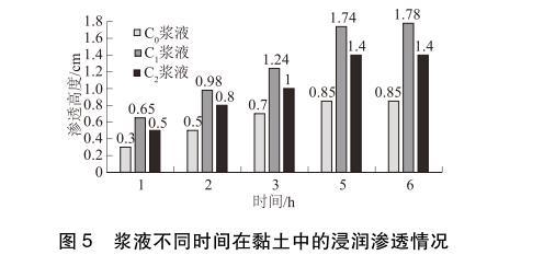從圖5的試驗結(jié)果可知:3種漿液在開始滲透后的3h內(nèi)浸潤滲透速度相對較快,3~5h之間,浸潤滲透速度相對變慢,5h后浸潤滲透高度趨于穩(wěn)定。在相同時間內(nèi),漿液在黏土中的浸潤滲透高度C1>C2>C0。滲透穩(wěn)定后,C1、C2漿液在黏土中的浸潤滲透高度比C0漿液的浸潤滲透高度分別提高了109.4%和64.7%,說明表面活性劑可以提高漿液的滲透性,且表面活性劑S1提高漿液滲透性的幅度更大。