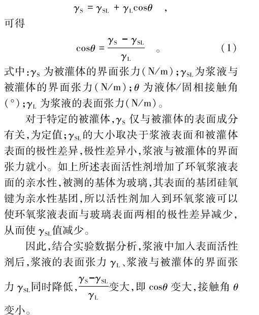 對于特定的被灌體,γS僅與被灌體的表面成分有關(guān),為定值;γSL的大小取決于漿液表面和被灌體表面的極性差異,極性差異小,漿液與被灌體的界面張力就小。如上所述表面活性劑增加了環(huán)氧漿液表面的親水性,被測的基體為玻璃,其表面的基團硅氧鍵為親水性基團,所以活性劑加入到環(huán)氧漿液可以使環(huán)氧漿液表面與玻璃表面兩相的極性差異減少,從而使γSL值減少。