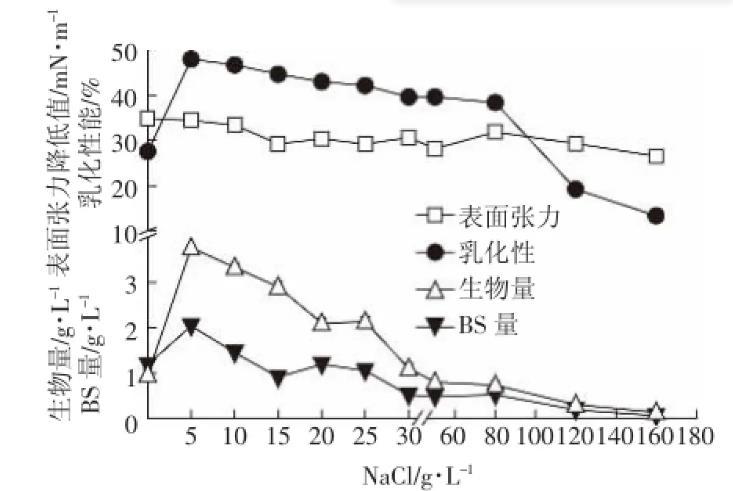 圖6 NaCl濃度對147細菌生長以及生物表面活性劑產(chǎn)量的影響