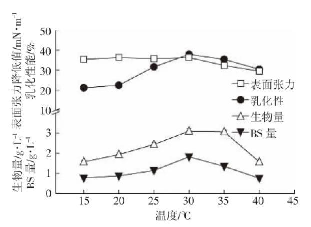 圖4溫度對147細菌生長以及生物表面活性劑產(chǎn)量的影響