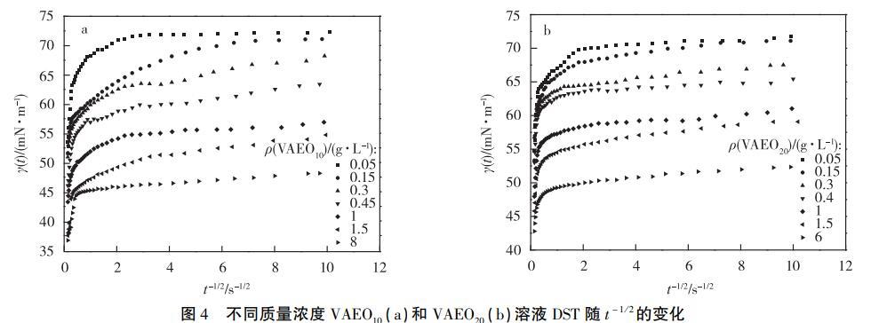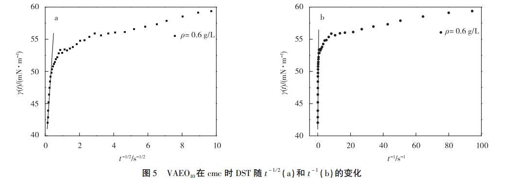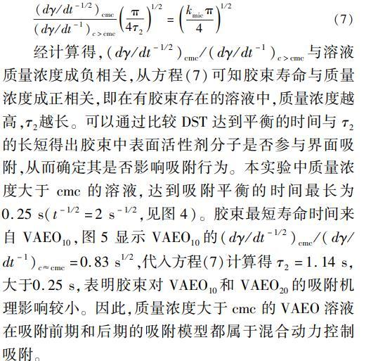 經(jīng)計(jì)算得,(dγ/dt-1/2)cmc/(dγ/dt-1)c>cmc與溶液質(zhì)量濃度成負(fù)相關(guān),從方程(7)可知膠束壽命與質(zhì)量濃度成正相關(guān),即在有膠束存在的溶液中,質(zhì)量濃度越高,τ2越長(zhǎng)??梢酝ㄟ^(guò)比較DST達(dá)到平衡的時(shí)間與τ2的長(zhǎng)短得出膠束中表面活性劑分子是否參與界面吸附,從而確定其是否影響吸附行為。本實(shí)驗(yàn)中質(zhì)量濃度大于cmc的溶液,達(dá)到吸附平衡的時(shí)間最長(zhǎng)為0.25s(t-1/2=2s-1/2,見(jiàn)圖4)。膠束最短壽命時(shí)間來(lái)自VAEO10,圖5顯示VAEO10的(dγ/dt-1/2)cmc/(dγ/dt-1)c≈cmc=0.83s1/2,代入方程(7)計(jì)算得τ2=1.14s,大于0.25s,表明膠束對(duì)VAEO10和VAEO20的吸附機(jī)理影響較小。因此,質(zhì)量濃度大于cmc的VAEO溶液在吸附前期和后期的吸附模型都屬于混合動(dòng)力控制吸附。