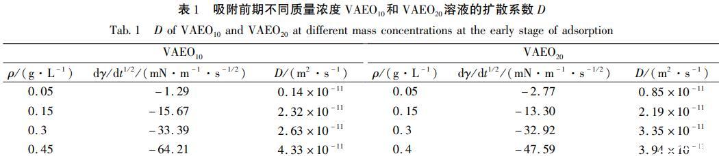 在初始吸附階段,表面層VAEO分子很少,可以用方程(2)來(lái)表述表面張力與時(shí)間的關(guān)系,對(duì)非離子表面活性劑,式中n=1.以y(t)對(duì)t/2作圖,結(jié)果見(jiàn)圖3.短時(shí)間內(nèi)γ(t)與t1/2成直線關(guān)系,直線截距對(duì)應(yīng)溶劑的表面張力,擴(kuò)散系數(shù)D可由直線斜率求出,結(jié)果見(jiàn)表1.