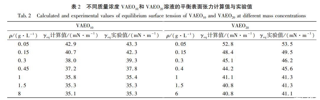 從以上對(duì)VAEO10和VAEO20在氣/液界面的吸附行為的研究可知,當(dāng)質(zhì)量濃度小于cmc時(shí),二者在吸附前期均表現(xiàn)為擴(kuò)散控制吸附,擴(kuò)散系數(shù)D的數(shù)量級(jí)為10-11m2/s,在吸附后期均為混合動(dòng)力控制吸附,表觀擴(kuò)散系數(shù)Da的數(shù)量級(jí)為10-12m2/s.膠束存在時(shí),τ2較長(zhǎng),大于到達(dá)γeq所需時(shí)間teq,膠束形成不影響表面張力隨時(shí)間的變化趨勢(shì)。據(jù)文獻(xiàn)報(bào)道,壬基酚聚氧乙烯醚(NPEO9)濃度小于cmc時(shí)的擴(kuò)散系數(shù)為3.9×10-10m2/s(滴體積法),平衡表面張力為30.6mN/m,可推測(cè)NPEO10的擴(kuò)散系數(shù)在3.9×10-10m2/s附近,大于本研究中VAEO10的擴(kuò)散系數(shù)。VAEO的疏水部分分子結(jié)構(gòu)比NPEO的大,前者較后者多一個(gè)縮醛環(huán)和一個(gè)甲氧基,這兩個(gè)基團(tuán)一方面造成VAEO的空間體積較大,另一方面,縮醛環(huán)中的——O-與水分子可能形成氫鍵,均增加了VAEO擴(kuò)散時(shí)的阻力,因而降低了擴(kuò)散速率。