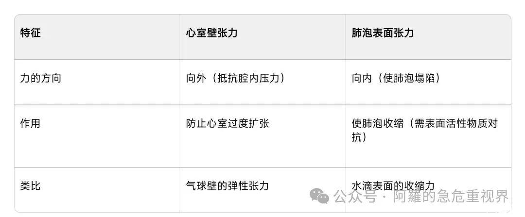 三、這兩種力的方向相反心室壁張力:把心臟想成一個(gè)氣球,心室壁張力就像氣球壁被里面的氣往外撐,方向是從里朝外、一圈圈地繞著球壁,幫助把血“擠”出去。肺泡表面張力:肺泡像極小的肥皂泡,表面張力就像肥皂膜總想把自己縮成最小,力的方向全是朝著泡中心,想把泡“掐”癟。一個(gè)向外推血,一個(gè)向內(nèi)掐泡。