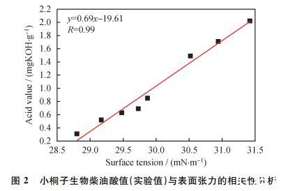 同時,對樣品的酸值與表面張力進行了相關(guān)性分析,如圖2所示: