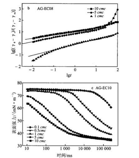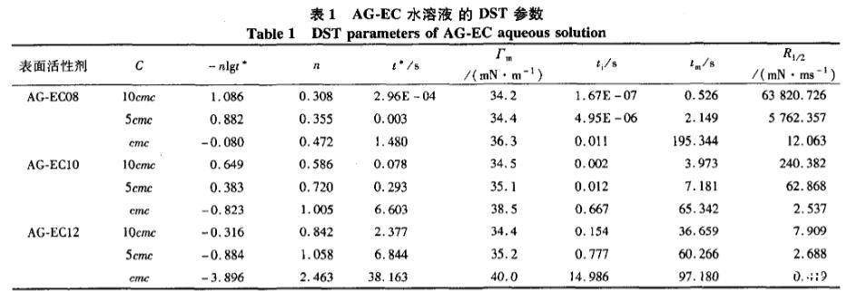 在25cc下測(cè)定不同濃度AG.EC水溶液的DST,并利用Rosen模型處理,得到其動(dòng)態(tài)表面張力參數(shù),見圖4、表1。